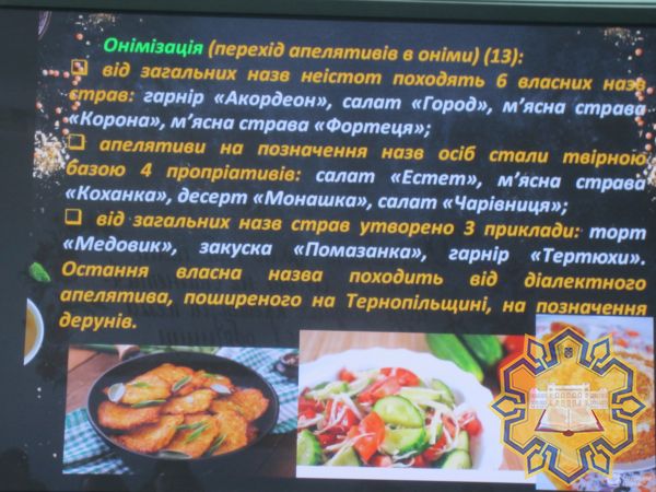Присутні познайомились із класифікацією менюонімів – власних назв страв, а також способами словотворення, за допомогою яких виникають досліджувані пропріативи в українській мові. Марія Олександрівна Зобенко розповіла, яким чином збирала, опрацьовувала й описувала фактичний матеріал, робила висновки та узагальнення, поділилася досвідом участі у всеукраїнському конкурсі.
