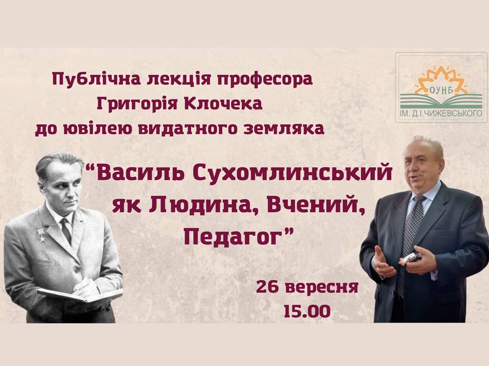 У рамках проєкту «Посіяти в душі добро» в Обласній науковій бібліотеці імені Дмитра Чижевського у відділі обслуговування користувачів відбудеться публічна лекція професора Центральноукраїнського державного університету імені Володимира Винниченка Григорія Клочека «Василь Сухомлинський як Людина, Вчений, Педагог».