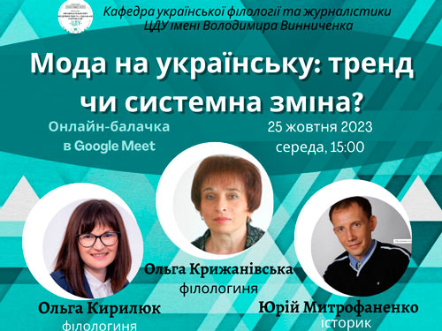 Будемо з’ясовувати це 25 жовтня 2023 року о 15:00 у ході онлайн-балачки «Мода на українську: тренд чи системна зміна?» за посиланням https://meet.google.com/vbs-rfhg-jbh