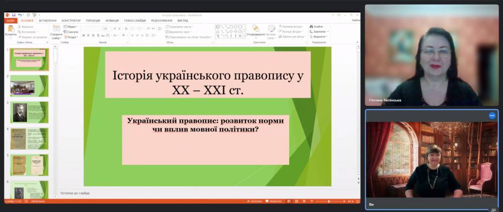 28 березня 2023 року відбулася гостьова лекція докторки філологічних наук, професорки кафедри української мови та методики її навчання Уманського державного педагогічного університету імені Павла Тичини Оксани Юріївни Зелінської на тему: «Історія українського правопису у ХХ–ХХІ ст.» для аспірантів ІІ курсу спеціальності «035 Філологія» та учасників наукового гуртка «Актуальні проблеми лексикології та граматики української мови» факультету української філології, іноземних мов та соціальних комунікацій. У підзаголовок винесене проблемне запитання: «Український правопис: розвиток норми чи вплив мовної політики?».