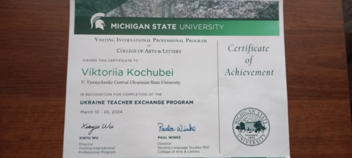Протягом 10 днів, з 10 по 20 березня 2024 року, доцент кафедри германських мов, зарубіжної літератури та методик їхнього навчання Вікторія Кочубей в складі групи з двадцяти викладачів англійської мови з педагогічних університетів України брала участь у програмі професійного стажування «Методи підготовки майбутніх вчителів англійської мови» в Мічіганському державному університеті (Michigan State University), м. Іст-Лансінг, США. Заснований в 1855 році, Мічіганський університет є одним з провідних закладів вищої освіти в США, в якому здобувають освіту більше 50 тисяч студентів. Професійний обмін викладачів в межах проєкту Visiting International Professional Program став можливим завдяки спільній роботі професорсько-викладацького складу програми TESOL (викладання англійської як іноземної мови), Відділення лінгвістики, мов та культур (Department of Linguistics, Language and Culture) та Центру вивчення англійської як другої мови (Second Language Studies) Мічіганського державного університету за сприяння Посольства США в Україні.
