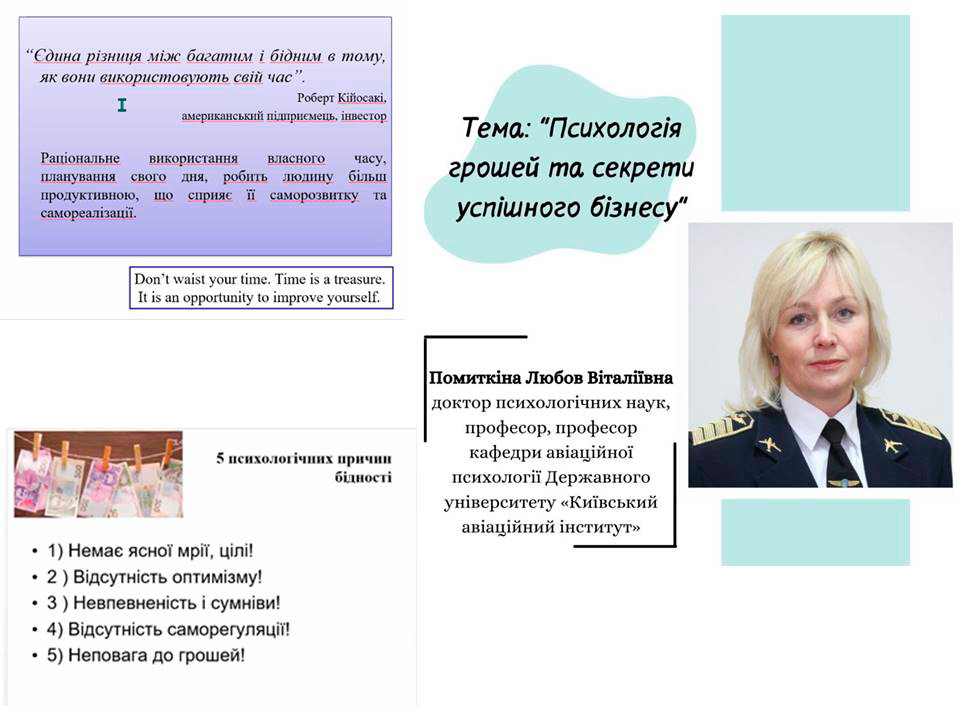 10 квітня 2025 року професорсько-викладацький склад кафедри менеджменту та підприємництва та здобувачі вищої освіти спеціальностей 073 «Менеджмент» та 051 «Економіка» Центральноукраїнського державного університету імені Володимира Винниченка взяли участь в онлайн-лекції на тему «Психологія грошей та секрети успішного бізнесу».