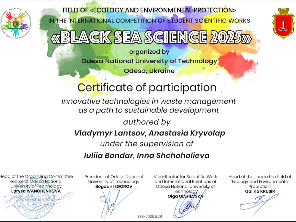 Значущим кроком у розвитку наукових досліджень у галузі менеджменту здобувачів першого (бакалаврського) рівня вищої освіти, спеціальності 073 «Менеджмент», членів гуртка «Сreative communication» Ланцова Володимира та Анастасії Криволап стала їх участь у Міжнародному конкурсі студентських наукових робіт «Black Sea Science». Вони представили свою наукову роботу англійською мовою на тему «INNOVATIVE TECHNOLOGIES IN WASTE MANAGEMENT AS A PATH TO SUSTAINABLE DEVELOPMENT» (Інноваційні технології у управлінні відходами як шлях до сталого розвитку), яка стала важливим внеском у розв'язання проблем екології та сталого розвитку через ефективне управління відходами.