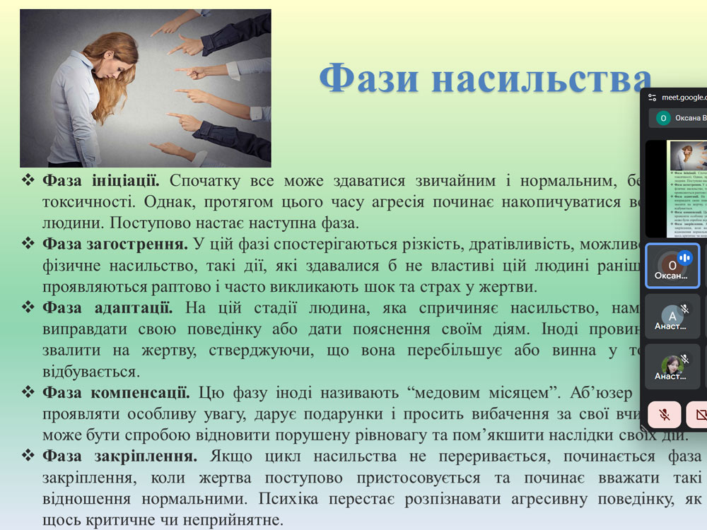 В рамках Всеукраїнської акції «16 днів проти насильства» 3 та 5 грудня 2024 року відбулись зустрічі психолога ЦДУ ім. В.Винниченка Оксани Миколаївни Гурової зі студентами груп ЕК22Б, ЕК24Б та МЛ22Б спеціальності 051 Економіка ОП Економічна безпека, факультету математики, природничих наук та технологій на теми «Я маю право жити без насильства» і «Стереотипи в роботі психолога» .