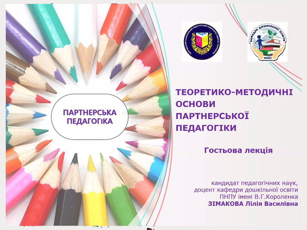 У рамках співпраці між кафедрою дошкільної та початкової освіти ЦДУ ім. В. Винниченка та кафедрою дошкільної освіти ПНПУ ім. В. Г. Короленка 28 листопада відбулася гостьова лекції для здобувачів освіти першого (бакалаврського) та другого (магістерського) рівня вищої освіти спеціальності 013 Початкова освіта та 012 Дошкільна освіта. Кандидат педагогічних наук, доцент кафедри дошкільної освіти Зімакова Лілія Василівна провела лекцію на тему «Теоретико-методичні основи партнерської педагогіки».