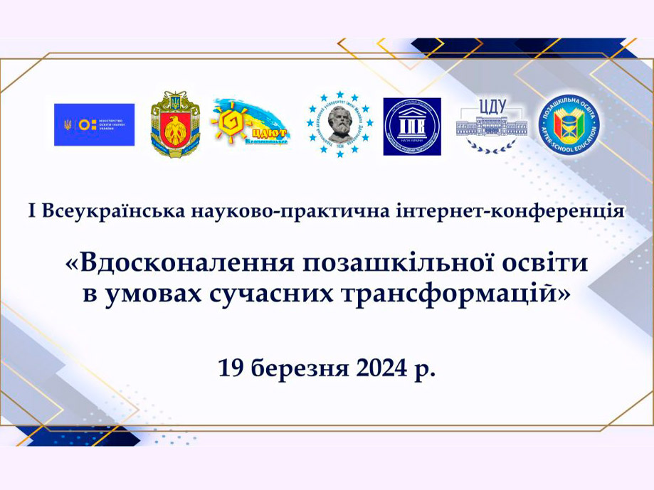 19 березня 2024 року під егідою Міністерства освіти і науки України та Департаменту освіти і науки Кіровоградської обласної державної адміністрації відбулася Всеукраїнська науково-практична інтернет-конференція «Вдосконалення позашкільної освіти в умовах сучасних трансформацій», яка започаткована Кіровоградським обласним центром дитячої та юнацької творчості. Співорганізаторами конференції виступили: Інститут проблем виховання національної академії педагогічних наук України, Український державний університет імені Михайла Драгоманова, Міжнародна асоціація позашкільної освіти, Центральноукраїнський державний університет імені Володимира Винниченка.