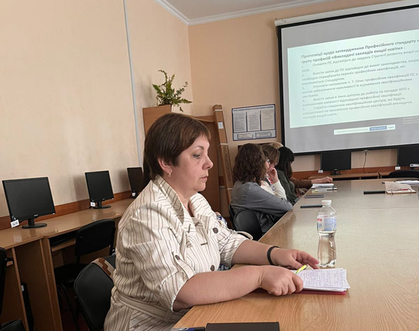 Викладачем кафедри перекладу, прикладної та загальної лінгвістики Ю.М.Верещак була піднята проблема впровадження Професійного стандарту на групу професій «Викладачі закладів вищої освіти». До уваги слухачів було запропоновано рекомендації щодо використання Професійного стандарту викладача на рівні ЗВО (інституційні політики, процедури, інструменти та освітні програми ПК / професійного розвитку НПП), розроблені авторським колективом Інституту вищої освіти НАПН України, ГО «Спілка ректорів закладів вищої освіти України».