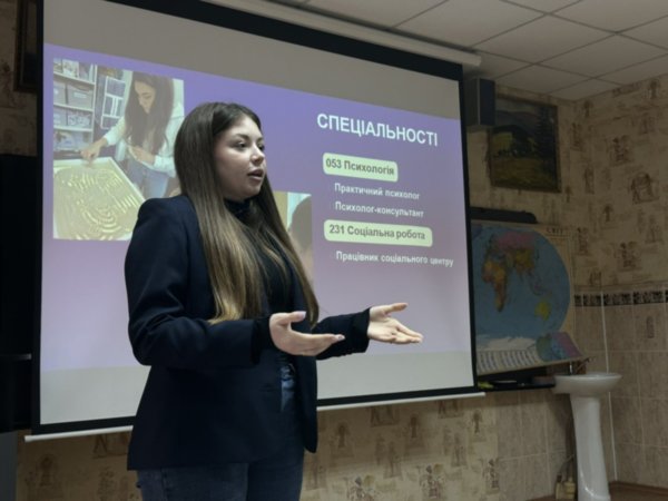 Під час заходу було акцентовано увагу на спеціальності 053 Психологія, розкрито потребу сучасного українського суспільства в умовах війни у високоякісних спеціалістах зі збереження психологічного і ментального здоров’я. Студентки Шароварова Вікторія і Мазур Анастасія поділились із здобувачами освіти власним позитивним досвідом навчання в нашому ЗВО: високим рівнем отриманих теоретичних знань, практичних умінь та початком професійної реалізації в практичній психології.