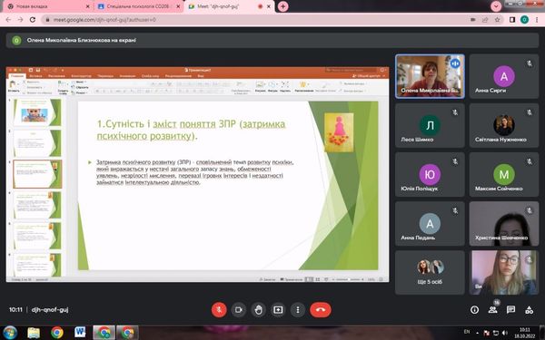 18 жовтня 2022 року на факультеті педагогіки, психології та мистецтв відбулася відкрита лекція на тему «Психологія навчання та виховання дітей із затримкою психічного розвитку (ЗПР)». Її провела старший викладач кафедри психології та соціальної роботи, кандидат психологічних наук  Близнюкова Олена Миколаївна. На лекції були присутні студенти спеціальності 016.02 «Спеціальна освіта», викладачі кафедри.
