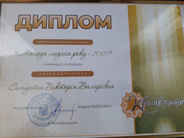 Вона була відзначена за особисту мужність та високий духовний і фізичний потенціал та отримала диплом міського конкурсу “Молода людина року – 2021”.