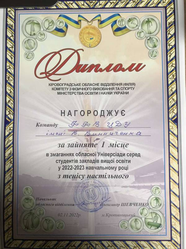 2 листопада 2022 року у спортивній залі комунального закладу «Комплексна дитячо-юнацька спортивна школа №3» міської ради міста Кропивницького проходили змагання Обласної універсіади серед студентів закладів вищої освіти з настільного тенісу. На цих змаганнях наш навчальний заклад представляли студенти факультету фізичного виховання – майстер спорту України, член національної збірної Всеволод Брояковський (група СП21М); кандидат у майстри спорту України Іван Цьома (група СП22Б); Каріна Шевченко (група ФК22Б1); Лідія Момот (група ФК20б1). Тренер – представник, старший викладач кафедри теорії та методики олімпійського і професійного спорту, кандидат педагогічних наук, Брояковський Олександр Вікторович.