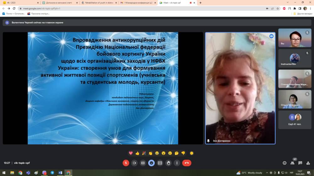 6. Кандидат педагогічних наук, доцент кафедри фізичного виховання, спорту та здоров’я факультету соціально-гуманітарних технологій та менеджменту Державного податкового університету Зоя ДІХТЯРЕНКО, доповідь: «Впровадження антикорупційних дій Президією Національної федерації бойового хортингу України щодо всіх організаційних заходів у НФБХ України: створення умов для формування активної життєвої позиції спортсменів (підлітки, учнівська та студентська молодь, курсанти)».
