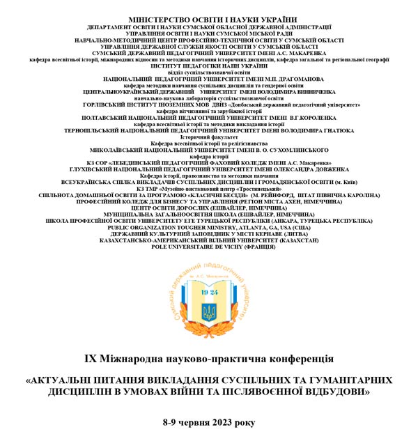 8 червня 2023 року відбулася IX Міжнародна науково-практична конференція «Актуальні питання викладання суспільних та гуманітарних дисциплін в умовах війни та післявоєнної відбудови». Були розглянуті такі питання: європейські цінності в українській історичній та громадянській освіті; вивчення російсько-української війни; виклики підготовки вчителя історії, правознавства та громадянської освіти тощо.