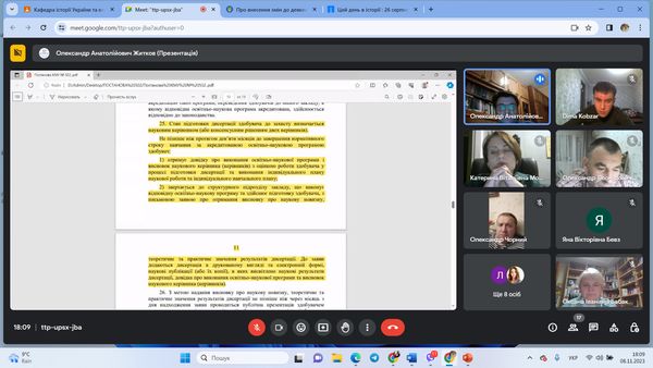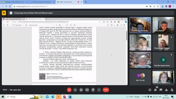 Відбулася робоча зустріч гаранта та групи забезпечення Освітньо наукової програми 032 Історія та археологія, що виконується в Університеті, із запрошеними науковими керівниками та здобувачами третього освітньо-наукового рівня вищої освіти з приводу ознайомлення з Постановою Кабінету Міністрів України від 19 травня 2023 року № 502 «Зміни що вносяться до постанов Кабінету Міністрів України з питань підготовки та атестації здобувачів наукових ступенів».