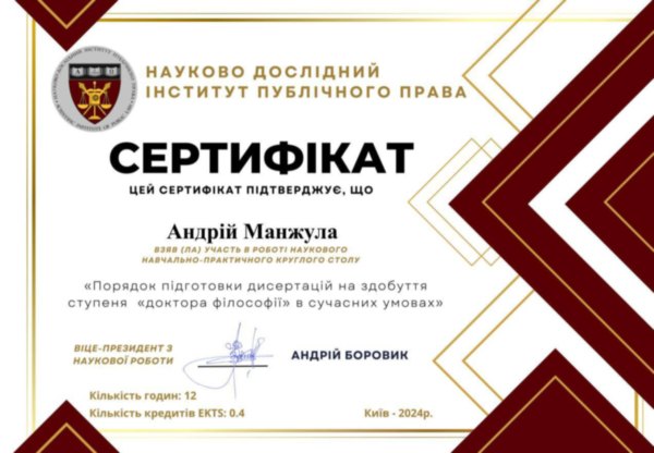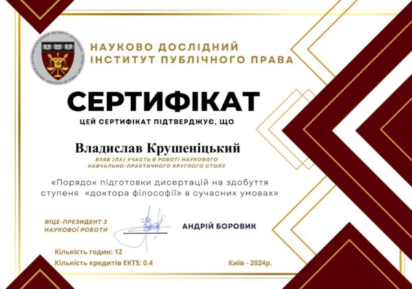 12 лютого 2024 року на базі Науково-дослідного інституту публічного права відбулося засідання науково-практичного круглого столу «Порядок підготовки дисертацій на здобуття наукового ступеня «доктора філософії» в сучасних умовах».