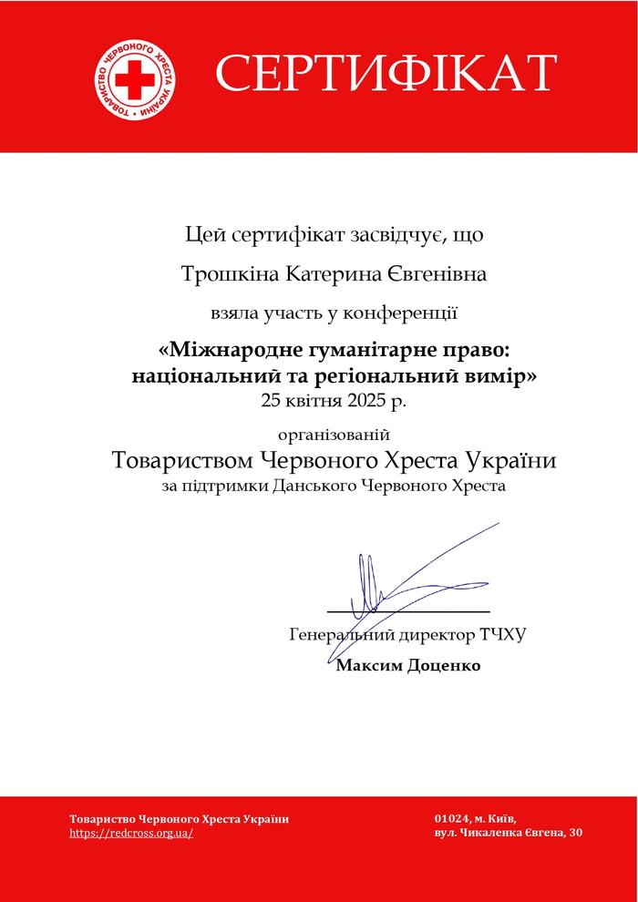 25 квітня 2025 року в Києві у змішаному форматі відбулася міжнародна конференція «Міжнародне гуманітарне право: національний та регіональний вимір», ініційована Українським Червоним Хрестом за підтримки Данського Червоного Хреста. Цей захід був проведений в рамках програми «Громадянське суспільство сприяє підвищенню стійкості в Україні» (PSPU) за фінансування МЗС Данії.