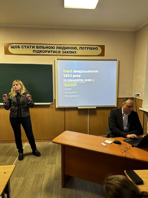 Доцентка кафедри Максименко Н.В. розповіла випускникам про перспективи здобуття правової освіти, престижність професії та можливості кар’єрного росту.