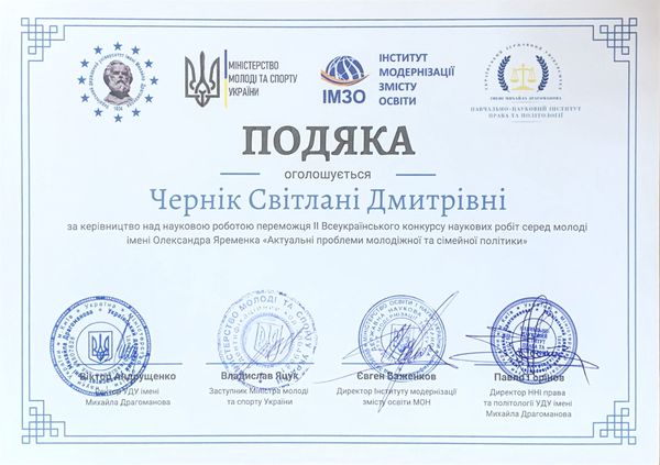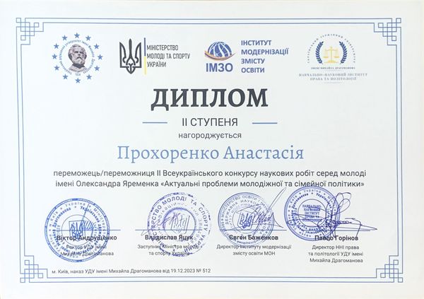 За результатами участі у ІІ Всеукраїнському конкурсі наукових робіт серед молоді імені Олександра Яременка «Актуальні проблеми молодіжної та сімейної політики» дипломом ІІ ступеня нагороджена студентка IV курсу першого (бакалаврського) рівня вищої освіти спеціальності 081 Право Прохоренко Анастасія. Наукова робота була представлена в секції «Молода сім’я в Україні: виклики сучасності та нові цінності». Науковий керівник – доцент кафедри права та правоохоронної діяльності Чернік Світлана Дмитрівна.