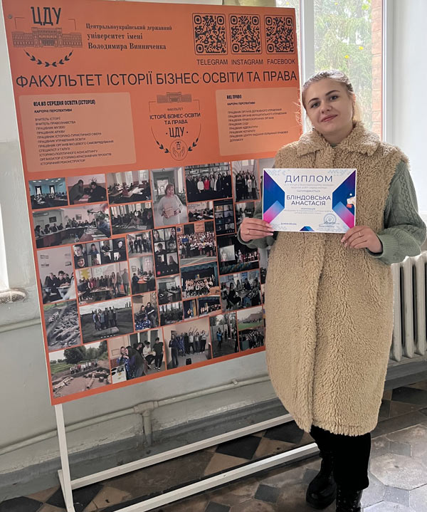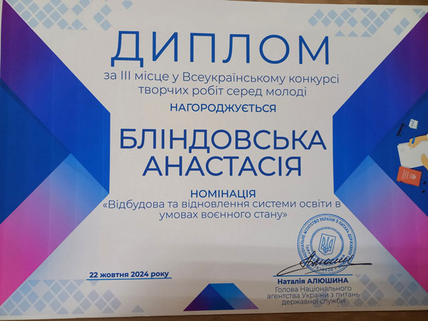 Серед переможців – студентка четвертого курсу першого (бакалаврського) рівня вищої освіти спеціальності 081 «Право» Бліндовська Анастасія Леонідівна, яка здобула диплом ІІІ ступеня в номінації «Відбудова та відновлення системи освіти в умовах воєнного стану». Її науковим керівником виступила доцент кафедри права та правоохоронної діяльності Максименко Наталія Володимирівна
