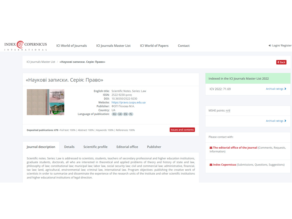 Науковий вісник «Наукові записки. Серія: Право» проіндексовано в міжнародній базі Index Copernicus