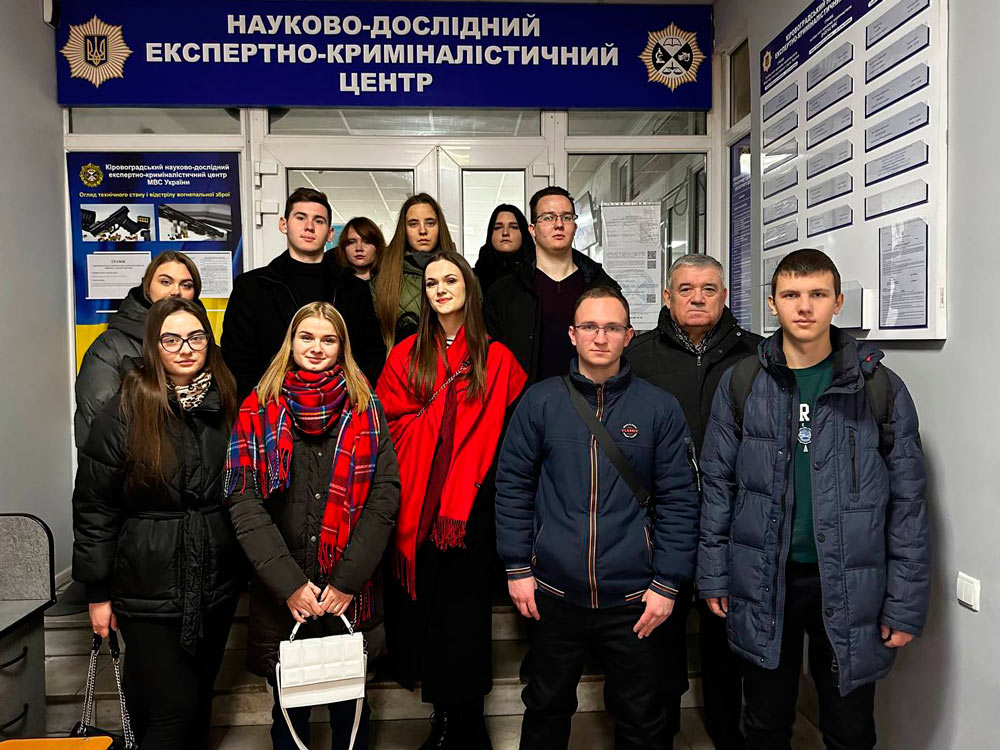 7 грудня 2023 року студенти-бакалаври освітньої програми «Право» та студенти-магістри освітньої програми «Правоохоронна діяльність» разом із професором кафедри права та правоохоронної діяльності ЦДУ ім. В.Винниченка Гриценком В.Г. відвідали Кіровоградський науково-дослідний експертно-криміналістичний центр МВС України. Студенти мали нагоду наживо ознайомитися з видами криміналістичних досліджень та процесом їх провадження.