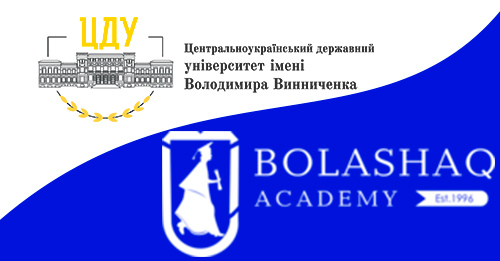 Кафедра права та правоохоронної діяльності ЦДУ імені Володимира Винниченка ініціювала підписання угоди про співробітництво між Академією «Bolashaq» Республіки Казахстан та Університетом, що сприятиме зростанню освітніх закладів на науковій та освітній ниві з юридичного фаху. Угоду підписали ректор ЦДУ імені Володимира Винниченка Євген Соболь та ректор Академії «Bolashaq» Гульнара Рисмагамбетова.