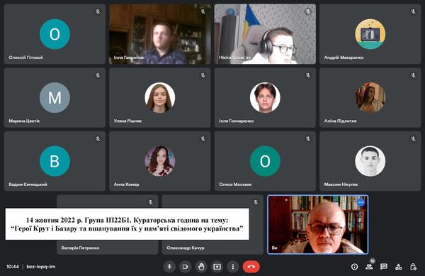 14 жовтня 2022 року для студентів першого курсу (спеціальність 014.03 Середня освіта (Історія), група ІП22Б1) була проведена кураторська година, присвячена Дню захисників і захисниць України, на тему «Герої Крут і Базару та вшанування їх у пам’яті свідомого українства».