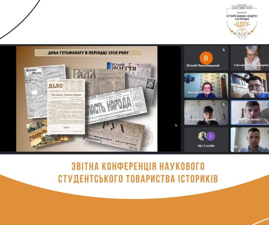 13 травня 2022 року на факультеті історії, бізнес-освіти та права відбулась звітна конференція наукового студентського товариства істориків. Захід став підсумком роботи наукових гуртків та проблемних груп кафедри історії України та всесвітньої історії у 2021 – 2022 навчальному році. Його робота була організована у межах двох секцій: «Історії України та методики викладання історії» та «Всесвітньої історії».