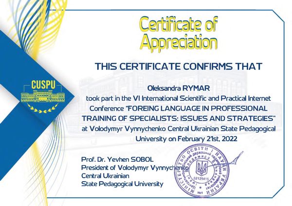 - Римарь О., Юрченко Т. ACADEMIC MOBILITY AS A NON-TRIVIAL WAY OF LEARNING ENGLISH / Online Book of abstracts of the sixth International scientific and practical Internet conference “Foreing language in professional training of specialists: issues and strategies”. – Kropyvnytskyi: EPC of Volodymyr Vynnychenko Central Ukrainian State Pedagogical University, 2022. – pp. 201-203.