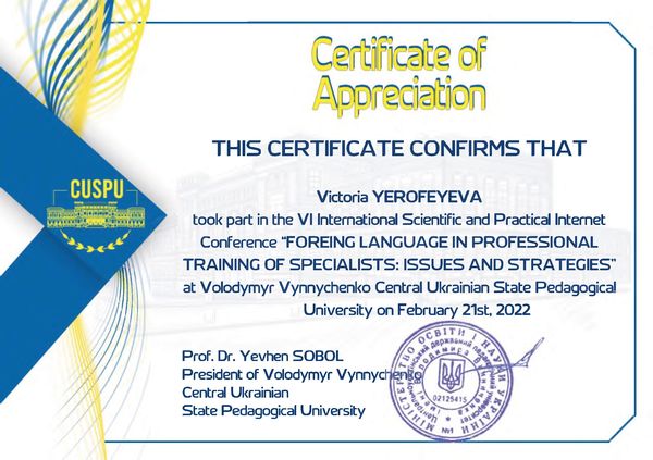 - Єрофеева В., Луценко В. THE PROBLEM OF “ACADEMIC MOBILITY” IN UKRAINE: THEORETICAL APPROACH / Online Book of abstracts of the sixth International scientific and practical Internet conference “Foreing language in professional training of specialists: issues and strategies”. – Kropyvnytskyi: EPC of Volodymyr Vynnychenko Central Ukrainian State Pedagogical University, 2022. – pp. 234-236.