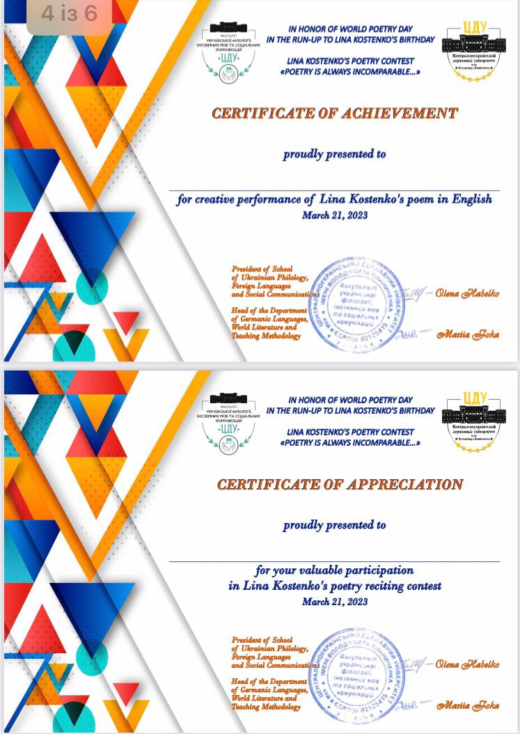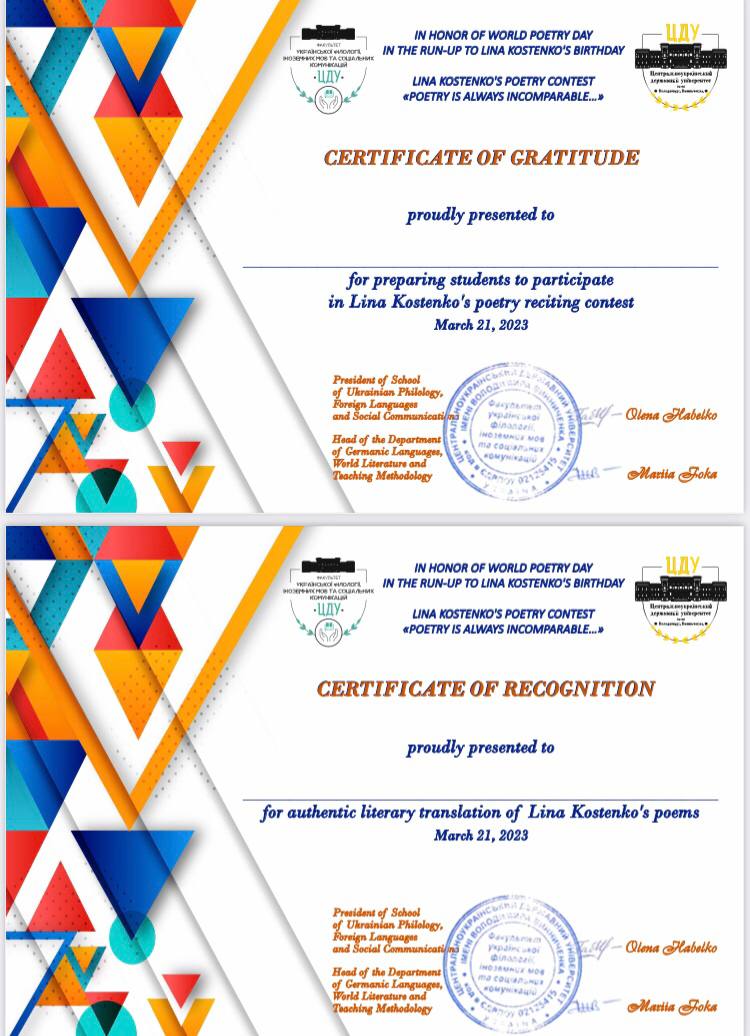 Конкурс Ліни Костенко на краще читання поезії Ліни Костенко англійською та німецькою мовами, що його проводила кафедра германських мов, зарубіжної літератури та методик їхнього навчання, завершився. Оргкомітет отримав понад 150 робіт від учасників з різних куточків України та різних навчальних закладів. Учасники проявили себе не лише як гарні читці, але й як креативні особистості. Саме тому перед важким вибором постало журі, що мало визначити — і це не перебільшення — кращих з кращих!