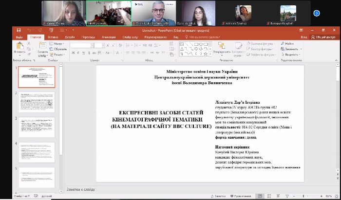Цього року співорганізатором конференції, разом із Ужгородським національним університетом і Маріупольським державним університетом, стала кафедра германських мов, зарубіжної літератури та методик їхнього навчання Центральноукраїнського державного університету імені Володимира Винниченка. З доповідями на пленарному засіданні виступили студентки 4 курсу спеціальності «Середня освіта (Мова і література (англійська)» Дар’я Літвінчук та Оксана Коркіш (науковий керівник – к.ф.н., доцент кафедри германських мов, зарубіжної літератури та методик їхнього навчання Кочубей В.Ю.).