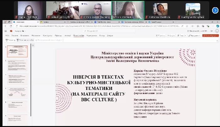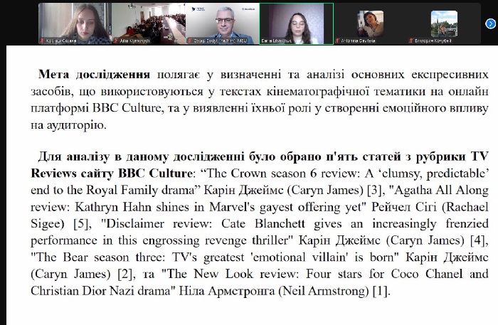 У своїй доповіді «Експресивні засоби статей кінематографічної проблематики (на матеріалі сайту BBC Culture)» Літвінчук Дар’я розповіла про роль емоційно-оцінної лексики та синтаксичних прийомів у створенні експресивності медіатекстів кінематографічної проблематики. Виступ Коркіш Оксани «Інверсія в текстах культурно-мистецької тематики (на матеріалі сайту BBC Culture)» був присвячений аналізу впливу інверсії на емоційне забарвлення та стилістичний ефект статей.