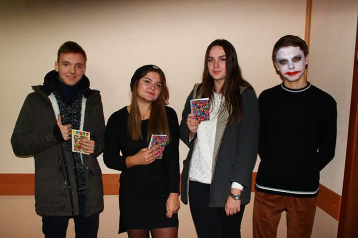 Тож, після першої пари, була проведена вікторина "Що я знаю про Хелловін". Всі учасники виявилися підкованими в запитання та отримали солодкі призи за свої відповіді. Найактивніші здобули невеличні записнички, які є досить потрібною річчю для студентів.