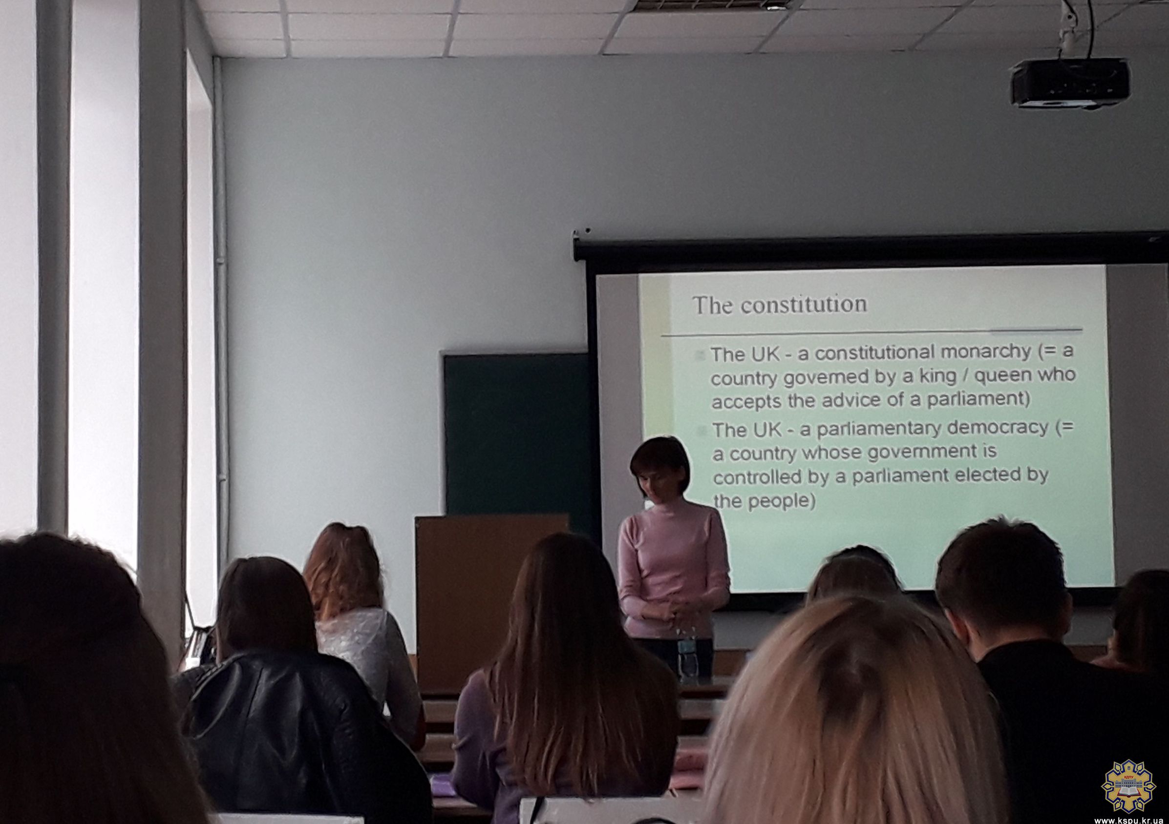 Лекція проходила в невимушеній атмосфері та з активним залученням аудиторії. Викладач не раз зверталась до фонових знань студентів, ставила питання та вільно спілкувалася з третьокурсниками. Лектор зуміла в доступній формі представити увазі студентства досить інформативний матеріал, вдало ілюструючи його прикладами та доповнюючи факти про державний устрій Великої Британії цікавими історіями та дотепними жартами. От би всі лекції запам’ятовувались так легко і надовго!