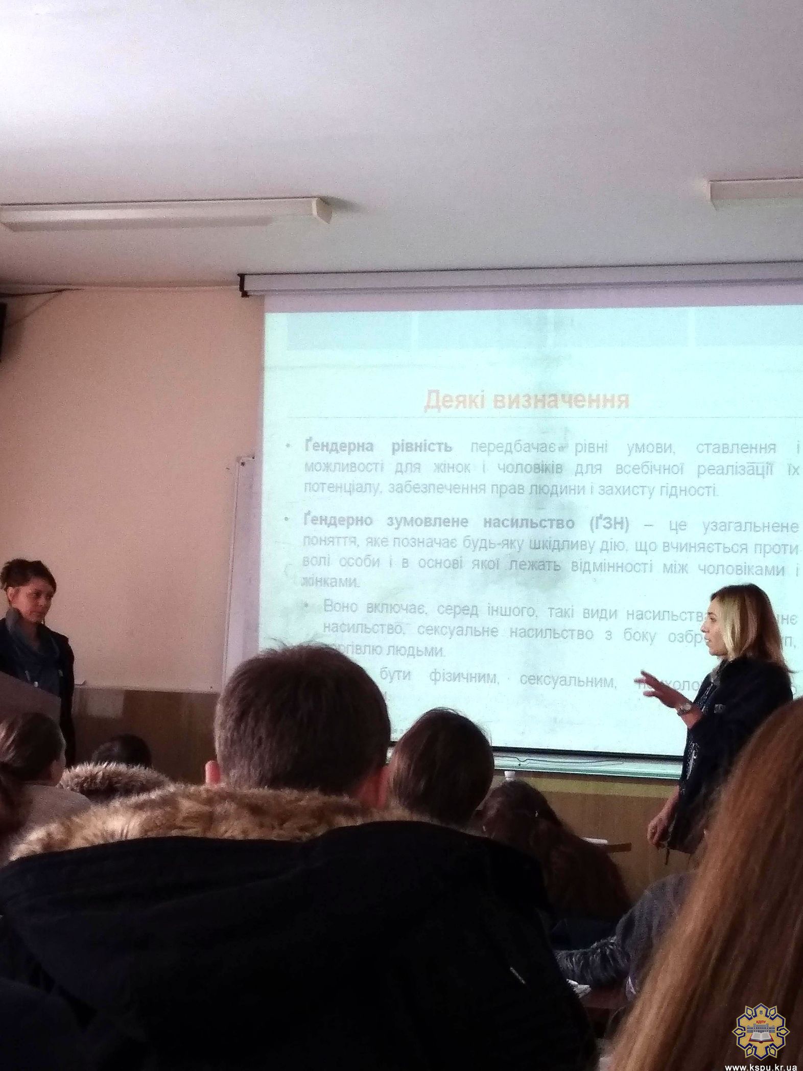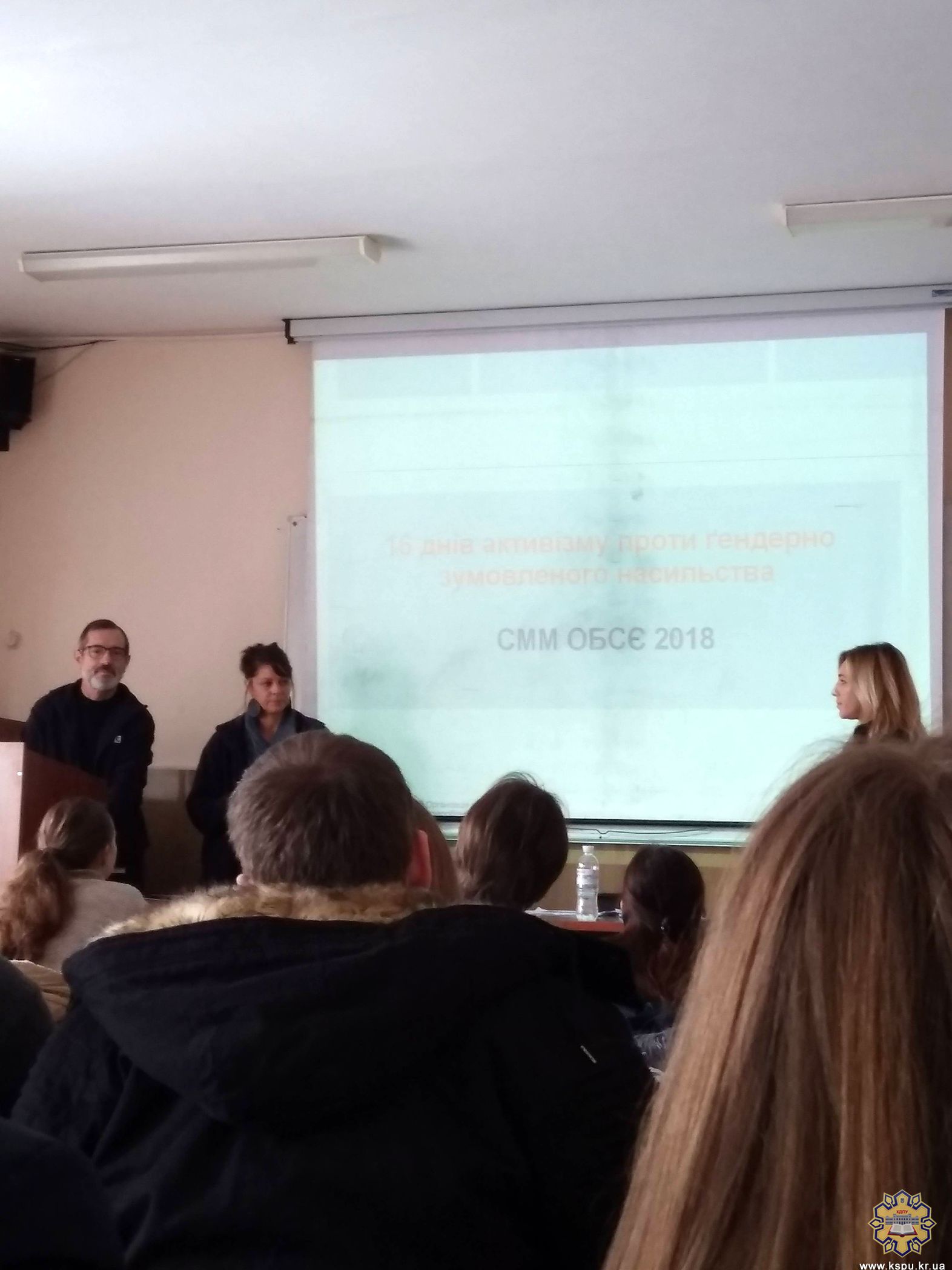 Темою заходу була не ситуація на сході України, як можна було б припустити одразу. Іноземні гості торкнулися іншої, не менш важливої теми «Гендерна нерівність і насильство щодо жінок: дві сторони однієї медалі». З’ясувалося, що команда ОБСЄ вперше завітала до Кропивницького, тож з приємністю відзначаємо, що візит видався успішним. В аудиторії яблуку ніде було впасти, а студенти активно долучалися до розмови, яка часом перетворювалася на жваву полеміку.