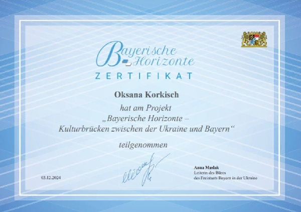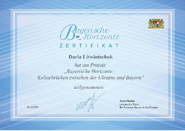 Студентки групи АН21Б факультету української філології, іноземних мов та соціальних комунікацій Дар’я  Літвінчук та Оксана Коркіш, які навчаються за освітньою програмою Середня освіта (Англійська й німецька мови та зарубіжна література) взяли участь у серії вебінарів «Баварські горизонти – культурні мости між Баварією та Україною», що проводилися з 4 по 29 листопада 2024 року. Проєкт організований Бюро Вільної держави Баварія в Україні та фінансується Баварською державною канцелярією. Серія заходів проводилася у співпраці з Баварським академічним центром для Центральної, Східної та Південно-Східної Європи (BAYHOST) та іншими партнерами.