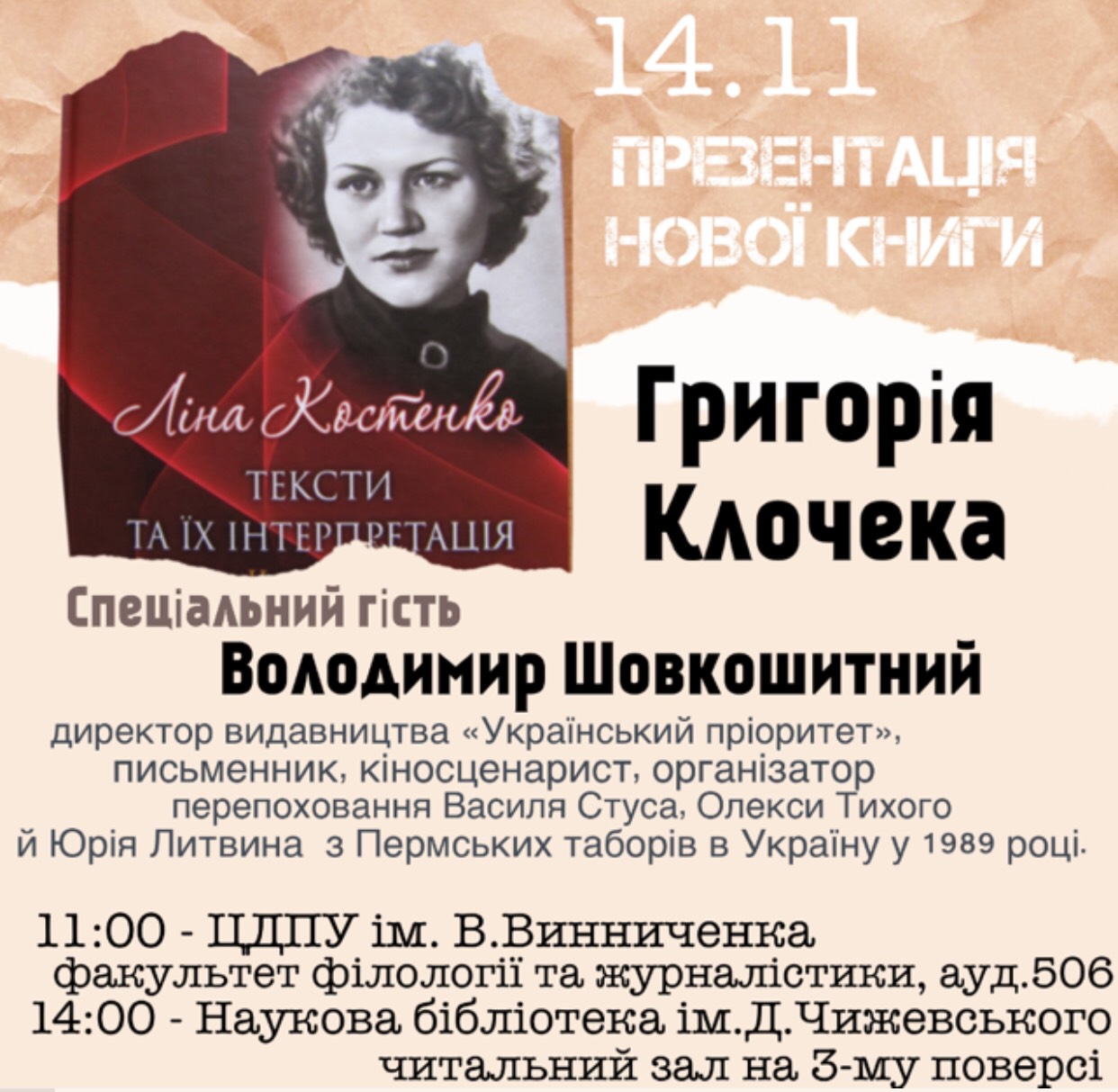 Довгоочікувана книга вийшла нещодавно у видавництві «Український пріоритет». На зустрічі зможете побачити і почути її автора - Григорія Клочека, доктора філологічних наук, професора кафедри української та зарубіжної літератури, а також Володимира Шовкошитного - це директор видавництва «Український пріритет», письменник, кіносценарист, доктор філософії, організатор перепоховання Василя Стуса, Олекси Тихого й Юрія Литвина з Пермських таборів в Україну в 1989 році.
