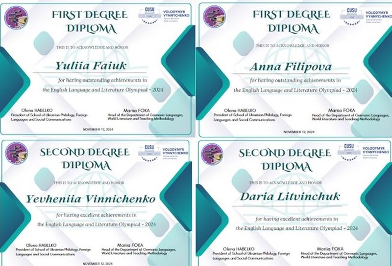 Тож час вітати переможців і призерів олімпіади – знавців англійської мови і літератури: 1 місце розділили між собою Юлія Фаюк (група АН21Б-401) та Анна Філіпова (група ПАН21Б-404), 2 місце присуджено Євгенії Вінніченко (група ЛА22Б-305) та Дар’ї Літвінчук (група АН21Б-402), 3 місце посіли Антон Майстренко (група ПАН23Б-203), Наталія Шевченко (група АН23Б) й Сергій Підхлібний (група ПАН23Б-201).