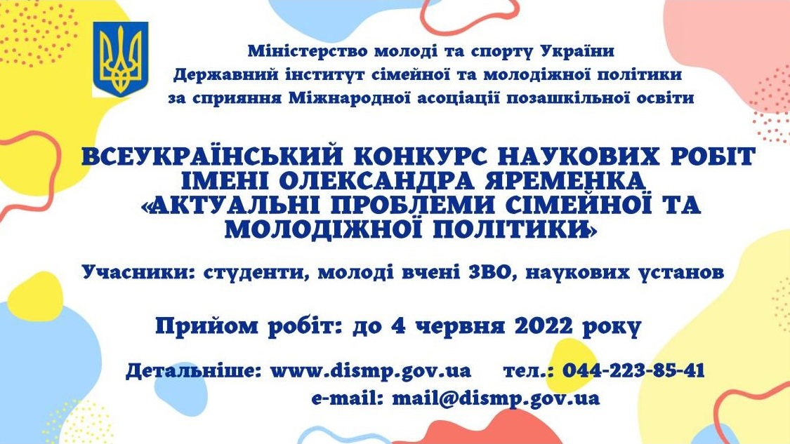 Державна установа «Державний інститут сімейної та молодіжної політики» (далі – Інститут) відповідно до статті 61 Закону України «Про наукову і науково-технічну діяльність», з метою виявлення та підтримки обдарованої студентської молоді, молодих вчених, створення умов для її творчого зростання, підготовки наукових кадрів вищої кваліфікації започатковує Всеукраїнський конкурс наукових робіт імені Олександра Яременка «Актуальні проблеми молодіжної та сімейної політики» (далі – Конкурс) за підтримки та сприяння Міжнародної асоціації позашкільної освіти.