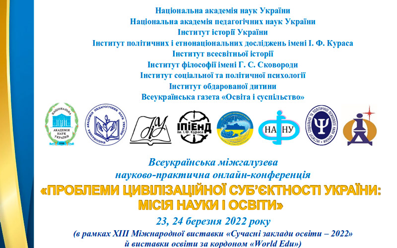 Шановні  колеги, відповідно до плану роботи Національної академії педагогічних наук України на 2022 рік 23, 24 березня, в рамках ХІІІ Міжнародної виставки «Сучасні заклади освіти – 2022» й виставки освіти за кордоном «World Edu», відбудеться Всеукраїнська міжгалузева науково-практична онлайн-конференція «ПРОБЛЕМИ ЦИВІЛІЗАЦІЙНОЇ СУБ’ЄКТНОСТІ УКРАЇНИ: МІСІЯ НАУКИ І ОСВІТИ».