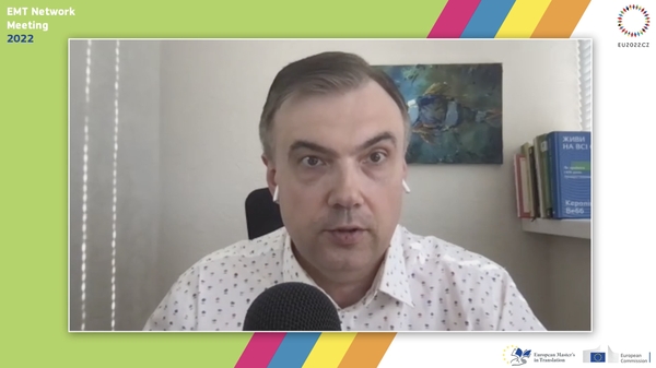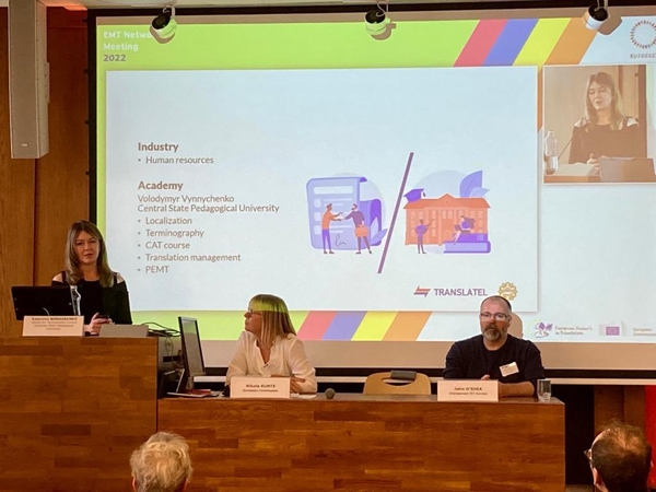 На чергову зустріч було запрошено представників нашого університету – доцентів Бондаренко К.Л. та Бондаренко О.С. – які доповіли про стан перекладацької галузі та університетської освіти в Україні. Викладачі кафедри перекладу, прикладної та загальної лінгвістики мають тісні зв’язки з мережею EMT, які реалізуються в спільних публікаціях та проєктах (Zürich: Masterstudiengang Angewandte Linguistik mit Vertiefung in Fachübersetzen ZHAW Zürcher Hochschule für Angewandte Wissenschaften, Departement Angewandte Linguistik, IUED Institut für Übersetzen und Dolmetschen, Krakow: przekładoznawstwo Uniwersytet Jagielloński w Krakowie, Katedra Przekładoznawstwa, Wydział Filologiczny), виступах на конференціях та круглих столах (Alcalá de Henares (Madrid): Máster Universitario en Comunicación Intercultural, Traducción e Interpretación en los Servicios Públicos), Salamanca: Máster Universitario en Traducción y Mediación Intercultural (MUTMI) Universidad de Salamanca, Departamento de Traducción e Interpretación, Vilnius: Vilniaus universitetas, Filologijos fakultetas, Vertimo studijų katedra, Poznań: Wydziałowe Studia Magisterskie w zakresie Tłumaczenia Specjalistycznego i Zawodowego (WSTSiZ) Uniwersytet im. Adama Mickiewicza w Poznaniu, Wydział Neofilologii we współpracy z Wydziałem Anglistyki).