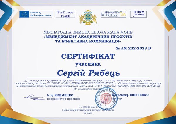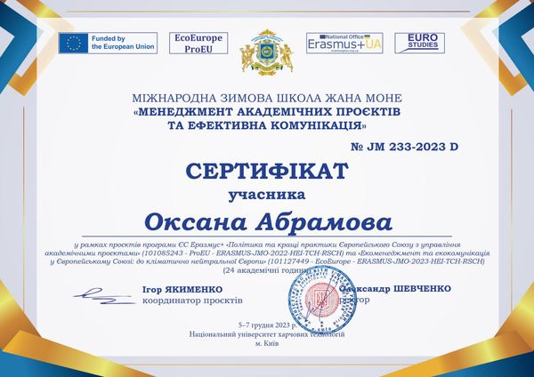 5-7 грудня 2023 р. на базі Національного університету харчових технологій (м. Київ, онлайн) працювала Міжнародна Зимова Школа Жана Моне «Менеджмент академічних проєктів та ефективна комунікація» у рамках проєктів програми ЄС Еразмус+ «Політика та кращі практики Європейського Союзу з управління академічними проєктами» (101085243 – ProEU – ERASMUS-JMO-2022-HEI-TCH-RSCH) та «Екоменеджмент та екокомунікація у Європейському Союзі: до кліматично нейтральної Європи» (101127449 – EcoEurope – ERASMUS-JMO-2023-HEI-TCH-RSCH).