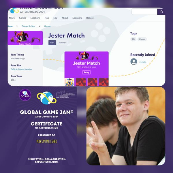 «Цього року я мав крутий досвід стати учасником Global Game Jam 2024 на локації у Кропивницькому та відвідати серію заходів для розробників ігор. Тема цьогорічного джему “MAKE ME LAUGH”, де за обмежений час потрібно було створити гру на цю тему та презентувати свої результати наприкінці. Вдячний за конструктивні зауваження та настанови представникам журі.