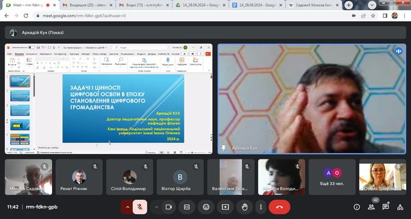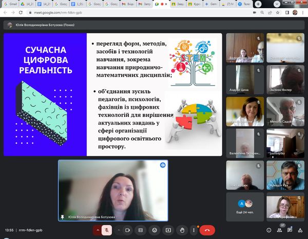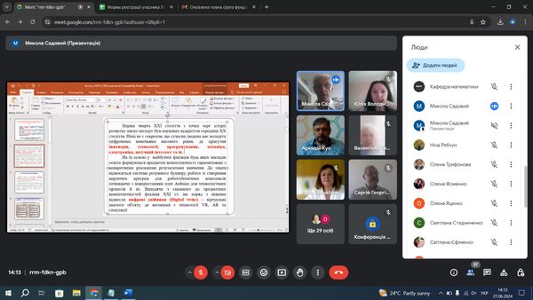 З великим зацікавленням учасники конференції слухали Юлію Ботузову доцента кафедри математики та цифрових технологій ЦДУ імені Володимира Винниченка про імерсивні технології у навчанні математики, до яких відносяться технології віртуальної (VR – Virtual Reality) та доповненої реальності (AR – Augmented Reality), що наочно забезпечує взаємодію суб'єктів навчання в тривимірному просторі, використовуючи звичайний смартфон для створення доповненої реальності або шолом і окуляри – для віртуальної. В продовження цікавого повідомлення професор Микола Садовий, професор Олена Трифонова, кандидат педагогічних наук Дмитро Соменко окреслили проблему формування предметних компетентностей фахівця ХХІ ст. через запровадження поняття цифрових двійників (Digital twins) – віртуальних аналогів реальних об'єктів, де вагомими є технології VR, AR та симуляції. Іншими словами це запровадження точної копії об'єкту, над якою можна роботи експерименти. Тоді поряд із реальним об'єктом (машиною) слід створювати точно таку віртуальну модель, на яку за допомогою датчиків, сенсорів подається інформація і здійснюється експериментування, виявлення недоліків у реальній машині і відразу вживаються заходи по їх ліквідації та ін.