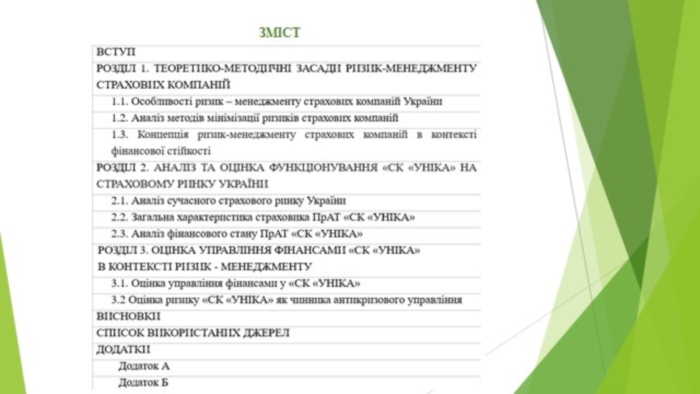 У роботі Яременко Л.І. розглянуто етапи формування ризик-менеджменту страхових компаній, методи мінімізації їх ризиків, висвітлено суть концепції ризик-менеджменту підприємства у контексті фінансової стійкості. Магістрантка проаналізувала ризик-фактори, які впливали на дiяльнiсть ПрАТ «СК «УНІКА» протягом 2019-2022 рр., показники фінансово-господарської діяльності страховика за досліджуваний період та оцінила ризик страхової компанії як чинника антикризового управління.