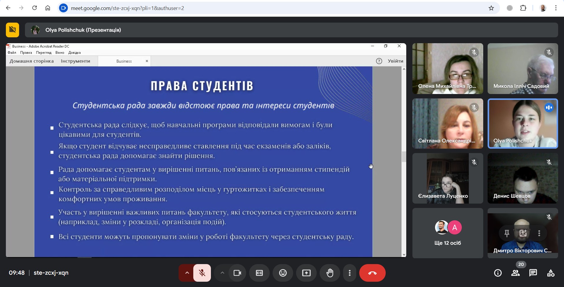 - Шлянчак Світлана Олександрівна поцікавилася, чи планується набір нових активних студентів до складу студради. Поліщук Ольга відповіла, що двері студентської ради завжди відкриті для всіх охочих: "Ми раді кожному, хто прагне змінювати факультет на краще".