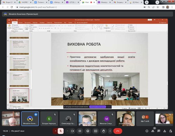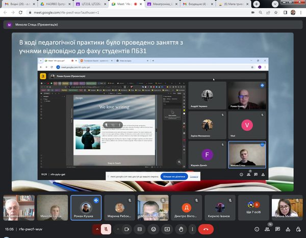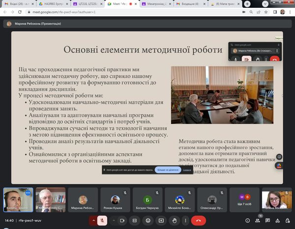 На підсумковій конференції крім студентів-практикантів були присутні: д.пед.н., проф. М.І.Садовий (керівник практики), д.пед.н., доц. М.М.Дубінка (методист з педагогіки), д.пед.н., проф. О.М.Трифонова та к.пед.н. Д.В.Соменко. Вони активно залучали студентів до дискусії, ставили важливі питання щодо їхньої підготовки, застосування отриманих знань на практиці та викликів, пов’язаних із використанням сучасного програмного забезпечення. Учасники конференції мали можливість обговорити труднощі, які виникали під час організації освітнього процесу та виховних заходів у закладах професійної освіти.