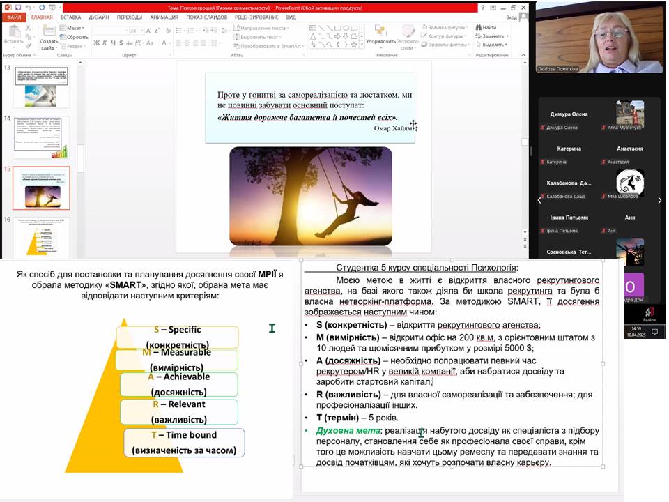 Онлайн-лекція стала важливим доповненням до навчального процесу з дисципліни «Фінанси, гроші та кредит», оскільки вона розкриває не лише технічні аспекти фінансових систем, а й психологічні основи взаємодії людини з грошима.