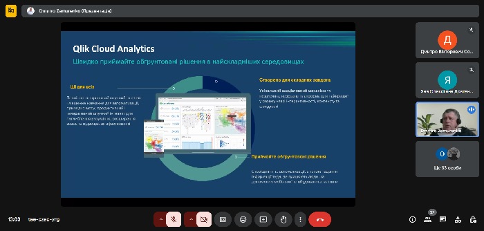 Однак ключовою ідеєю лекції було не лише окреслення проблем, а й демонстрація сучасних рішень. Дмитро Замуренко поділився особливостями роботи з платформою Qlik Cloud Analytics, яка дозволяє об’єднувати дані з різних джерел, створювати інтерактивні дашборди, працювати з геоаналітикою, прогнозувати тенденції за допомогою вбудованого штучного інтелекту та формувати звіти в автоматичному режимі. Особливо цікавою для учасників стала розповідь про асоціативний аналітичний двигун Qlik, що дозволяє швидко знаходити зв’язки між даними у будь-яких напрямках — без потреби у складному програмуванні чи побудові жорстких SQL-запитів.